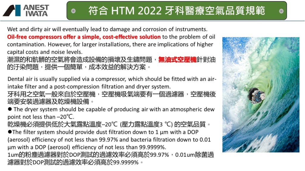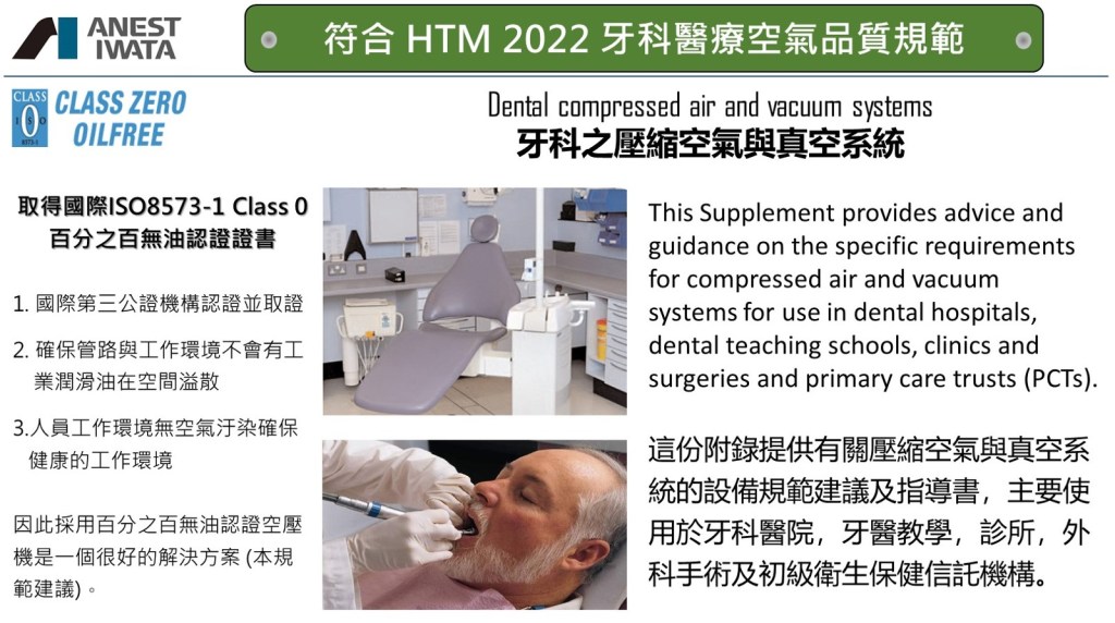 HTM2022 (Health Technical Memorandum) 針對牙醫診所、牙醫醫院及牙科教學無油空壓機系統在補充文件1.中有許多安全規範的建議與規定,簡單選取重點提供各位牙醫師們或醫院工務單位參考。補充文件1.之規範: