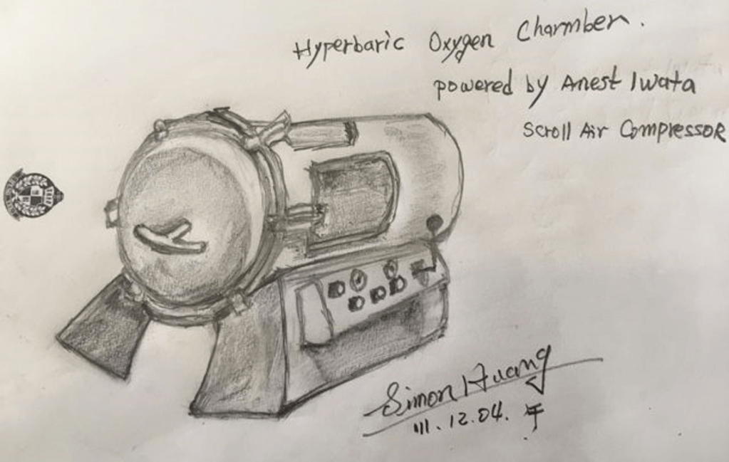 高壓氧艙設備需要100%無油潔淨壓縮空氣供應。 高壓氧氣治療是將病人置於高壓艙內,讓他們以一般自然呼吸的方式呼吸1.6 到 3 個大氣壓純氧氣的一種治療方式。病人在高壓艙內的呼吸量是平常空氣中氧氣的八至十五倍,其吸入的純氧溶解於血漿中提昇了組織內的氧氣含量,相當於1/3紅血球攜帶氧氣的功能。