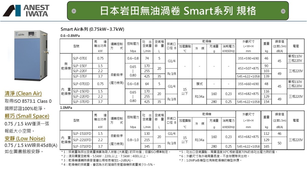 ISO 8573-1 是 國際標準組織壓縮空氣品質標準,最高等級空氣品質是Class 0 百分之百無油零檢出;此外,日本岩田無油渦卷式空壓機取得日本Top Runner能源管理制度認證並獲得日本能源局省能源機器大賞殊榮!