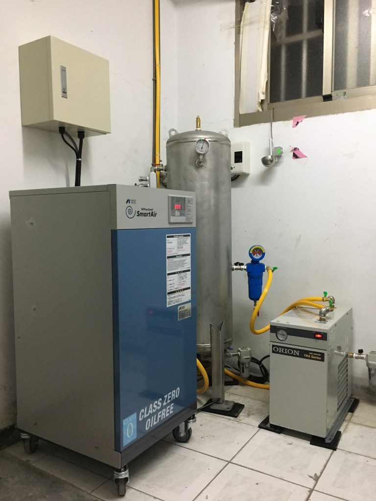3.工業型無油渦卷式空壓機是蠻合適應用於3D金屬列印採用的系統(上圖)。依據我們的經驗, 通常3D金屬列印加工機廠商建議的空壓機馬力數或實際排氣量需求會過大, 因為廠商會依據Max的尖端用氣量來提供情報, 我們曾經在加工機廠商建議採用7.5馬力~10馬力空壓機後, 實際估算並測試, 最終只需要3馬力無油渦卷式空壓機就夠用且能夠支持整個牙體技術所用氣!