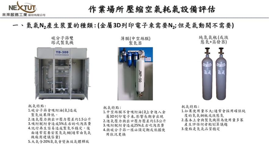 2.通常以壓縮空氣壓力7~8公斤左右供應給氮氣機所產生的能效較優(視3D金屬列印機搭配的製氮純度需求有異; 而在雷射切割應用則視切割的鋼板厚度不同而需要不同壓力);但是仍舊以氮氣機與加工機廠商規格為主要參考依據。如果採用整個作業系統的壓縮空氣為來源,可以選配增壓機來提昇氮氣機所需的局部較高壓力節省能源,而不要提升整個作業區系統壓力。因為每提高1公斤壓力,耗電增加8%。