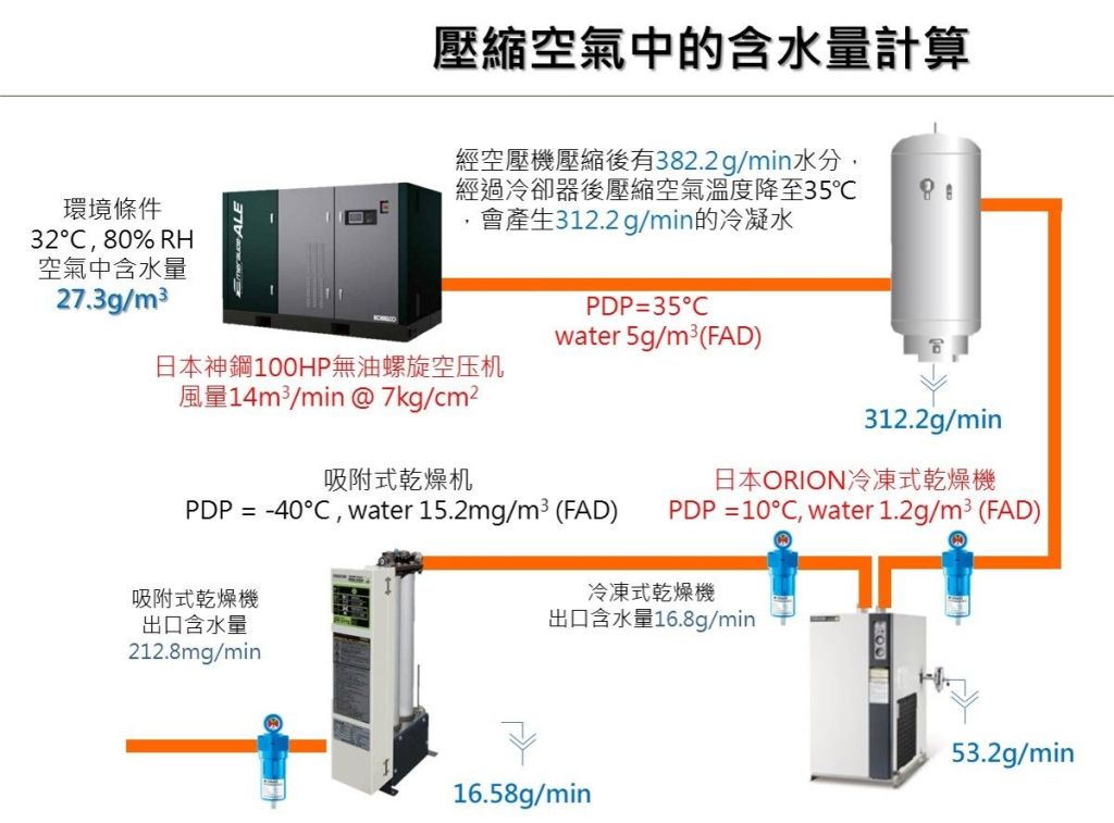 以100馬力空壓機為例 (各位可以稍微依據上圖, 依據自己家空壓機的馬力數排氣風量稍微計算一下), 空壓機壓縮大氣之後排出的冷凝水中, 有將近80%以上是被空氣桶蒐集起來了, 因為在夏天將近50~60度C的壓縮空氣會在空氣桶冷卻降至35度C左右, 壓縮空氣中的水氣於是變成顯形冷凝水.