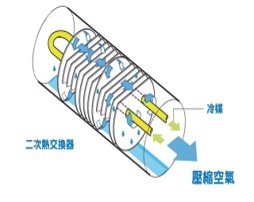 - 專利設計雙層結構熱交換器 : 不鏽鋼外殼, 可防止熱交換器內部生鏽, 可防止自動排水器因生鏽而阻塞, 可防止各種過濾器因生鏽而阻塞, 將一次熱交換器及二次熱交換器做成一體,可節省空氣乾燥機的空間。(下列第三張圖)