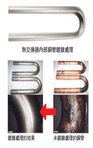 - 熱交換器內部銅管厚度確保並採鍍鎳處理 (下圖), 確保銅管不易破管故障或影響熱交換效率。