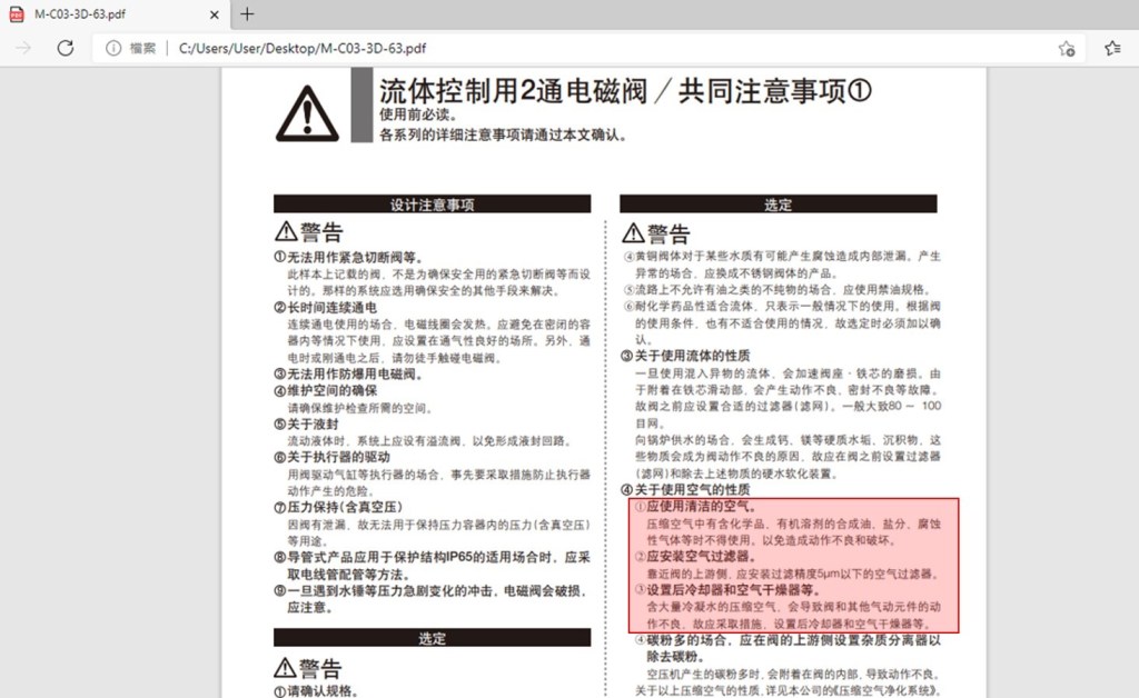 電磁閥對於壓縮空氣品質的主要要求在三個部分 (請參考上圖日本SMC網站的路徑):