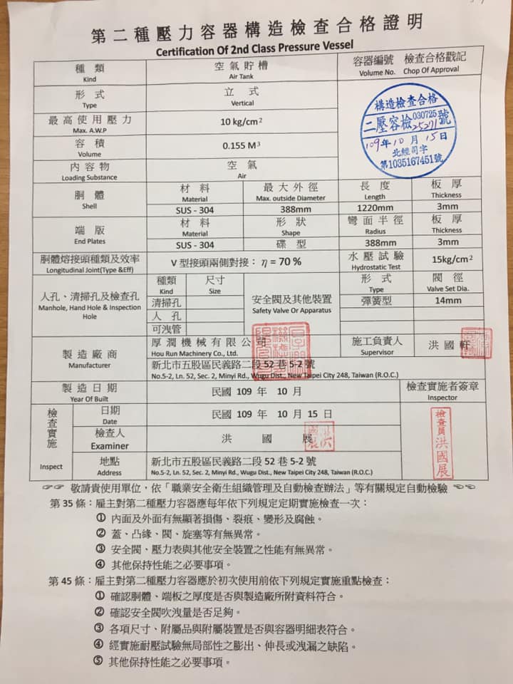 - 空氣桶是否有取得勞動部工業安全的第二壓力容器合格證書與標示工檢證號的銘牌(請見下兩張圖)。