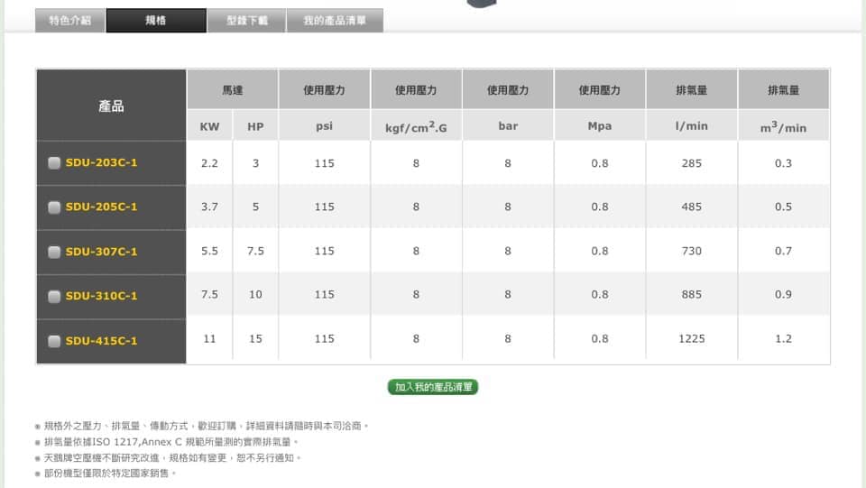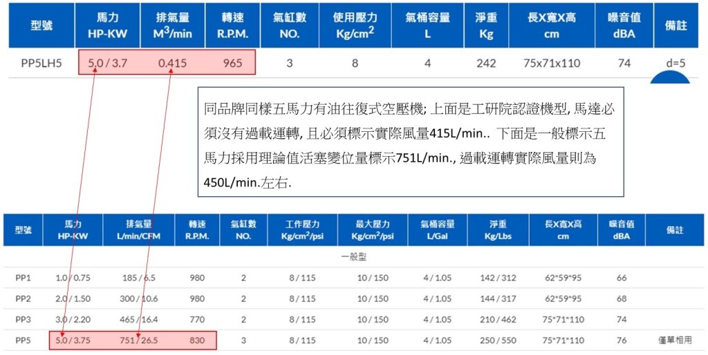 活塞變位量指空壓機壓縮腔在完全沒有損失下的理論值;以往復式空壓機而言,因為活塞行程不可能完全貼合到上方氣缸蓋而會有餘隙、活塞環與氣缸壁摩擦也不可能完全密合而會產生間隙回流….。因此,活塞空壓機的實際排氣量約為理論值的活塞變位量的55%~65%。(同一款機型,下圖產品銘牌表示的是活塞變位量、下下圖則是馬達SF1.15~SF1.2過載5%~10%實際排氣量)。