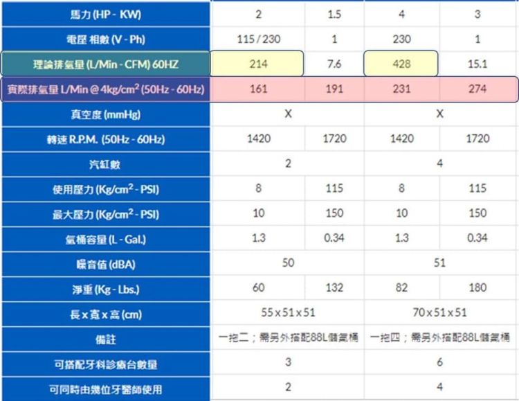 牙科行業的空壓機排氣量標示有採用各種不同方式來呈現, 極容易讓牙醫診所或牙體技術所決策者或使用者混淆,因此想要與各位先進分享空壓機的排氣量(風量)。因為各位先進的診所或牙技所要的是能夠滿足診療或作業設備使用的特定壓力下的實際排氣量。