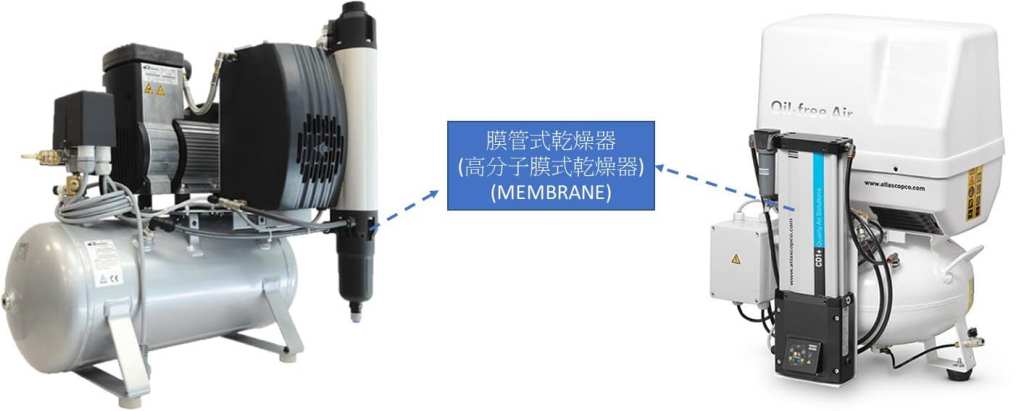 牙醫診所及牙體技術所的空間有限,因此通常會選用配置在空壓機成為一體式的膜管式乾燥器(Membrane;或稱高分子膜式乾燥器; 或稱中空絲膜乾燥器)。