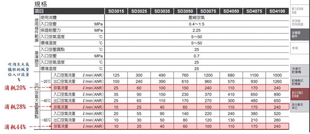 - 空間因素選用膜管式乾燥器,一般常見採用機型的耗能耗氣吹洩量約15%~30%左右; 採用膜管式乾燥器必須設計止回閥與電磁閥於管路上, 否則膜管會一直吹洩排氣, 不管是否有在用氣都會浪費壓縮空氣。