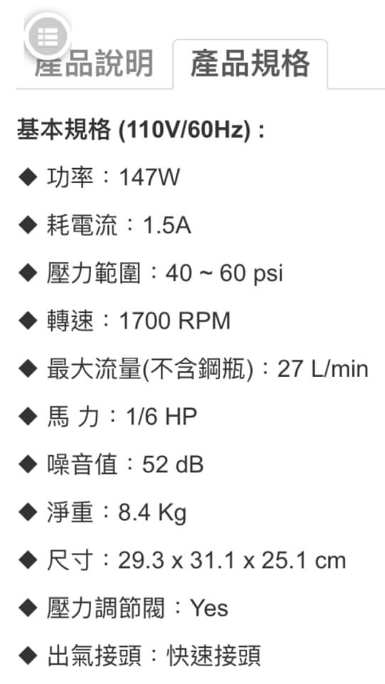 但是風量如果沒有將‘’壓力‘’前提規範清楚,那麼就會產生很大的混淆空間。例如:圖中的規格是40~60psi壓力下,最大風量27L/min。這如果應用在牙科經常應用到的壓力範圍 4.5~7.5 bar 將會有很大無法對應的麻煩與困擾, 當然廠商如果為了混淆風量背後壓力所占有的意義, 那麼該廠商投機水分將讓空壓機系統供氣不順: