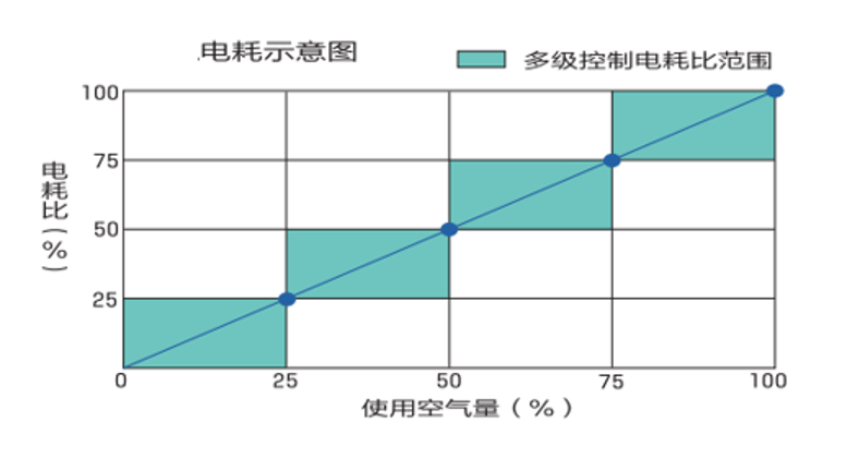 三, 多模組設計,現場用氣多少就開多少模組,達到近乎等比例增減耗電的曲線;較變頻式空壓機省電, 比一般單模組空壓機更省電。
