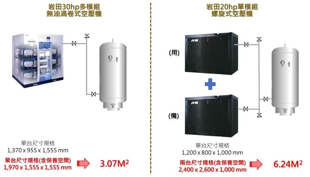 建置空壓機系統的成本佔空壓機系統整個使用生命週期Total Cost of Ownership的12~15%,而不包含使用空間的成本;從下圖岩田單模組的螺旋式空壓機與岩田多模組的無油渦卷式空壓機來比較,螺旋式空壓機通常會採購兩套,一備一用。姑且不論配管配線需要兩套、通風熱排需要兩套;兩套20hp螺旋式空壓機含保養所需要的空間,總佔地面積為ˊ6.24M2 (約1.89坪)。多模組無油渦卷式空壓機佔地面積則約3.06M2 (約0.93坪),相較於螺旋式空壓機的系統,多模組無油渦卷式空壓機系統節省了約1坪的空間 (0.97坪),在台北市可以節省約85萬元的坪效成本、新北市約40萬元、台中市與高雄市約25萬元的佔用成本。