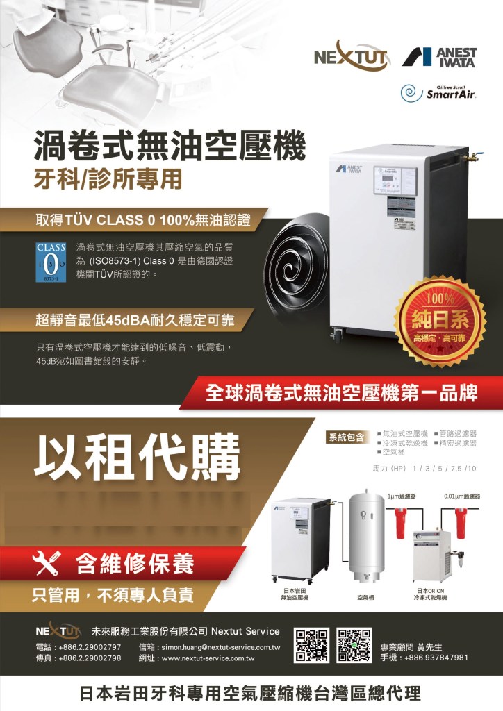 未來服務工業導入日本岩田無油渦卷空壓機系統在台灣的牙科專業行業,並以PaaS產品服務化商業模式進行行業客戶服務;因為牙醫診所與牙體技術所對於本身的核心專業技術能力十分在意且專注,對於支援執行核心業務的支援系統有越來越高的期待,也深知自己要的是潔淨的壓縮空氣而不是空壓機系統設備!因此,2018年推出 “以租代購" 的長期租用服務方案,讓牙科行業客戶可以無後顧之憂, 我們更期望客戶忘了我們的存在;更希望我們能夠提供客戶提升生產力以及提升營運彈性的高附加價值服務: