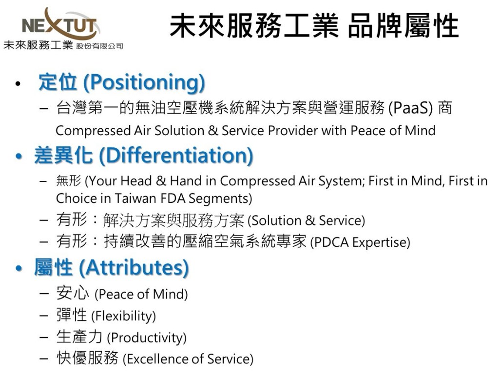 未來服務工業 NextUT 是一家服務基礎的企業, 因此要提供給客戶品牌的覺知的時候, 難度要比單純做產品的廠商來得高; 因此, 做服務品牌必須更加定義自己的品牌背後的意涵, 然後再進一步在各方面展開支撐品牌的理念, 定位與行動計畫.
