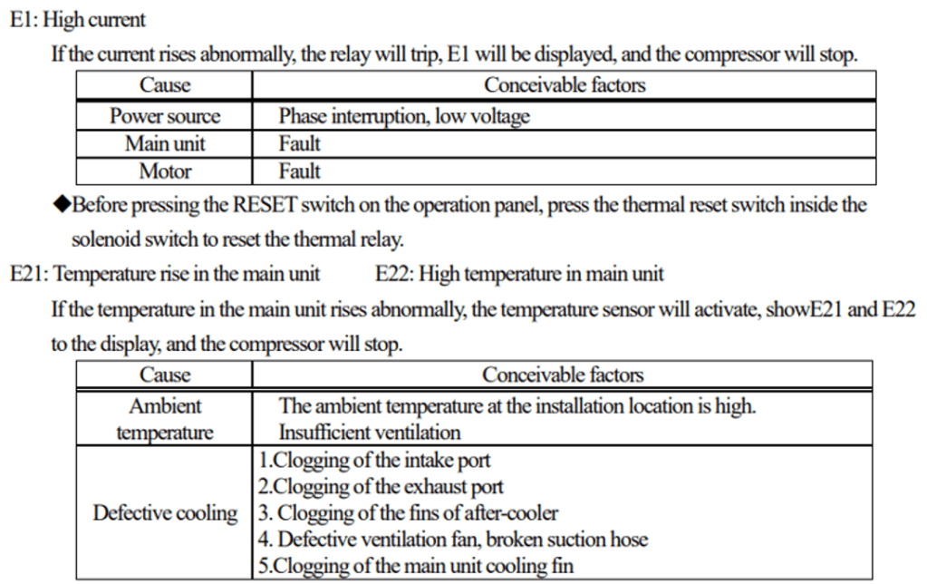 - 過電流保護 : 當電流達到過載設計值時,空壓機會自動跳脫,避免電氣元件受到損壞。