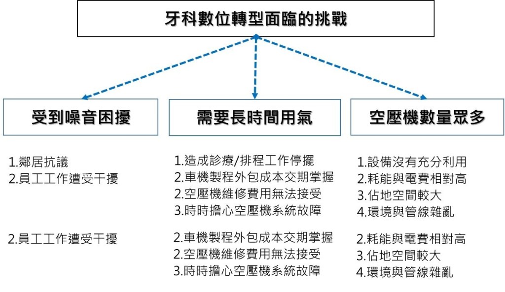 我們曾經聽過不少牙體技術所執行長提到, 因為空壓機非預期的故障, 空壓機想要修理但是卻因為機體燒結不易更換內部零件, 因此不得已高額更換機體馬達; 如果要等維修保養機體, 卻又要花幾個星期的時間, 只好將外包加工 (成本提高, 但是最擔心的還是品質…). 我們整理了一下, 牙體技術所數位化之後, 在空壓機系統方面面臨的挑戰如下.