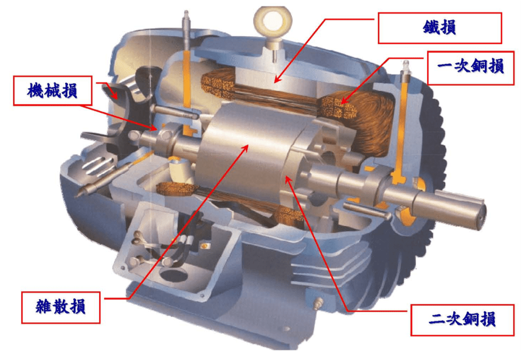 空壓機十分重要的關鍵部品屬機體, 馬達與電器元件; 其中馬達更是攸關空壓機整機的壽命與耐久可靠度. 馬達整體結構設計如下且請參考造成效率因素的各種損失 :