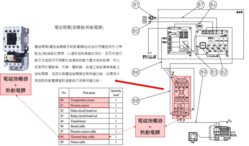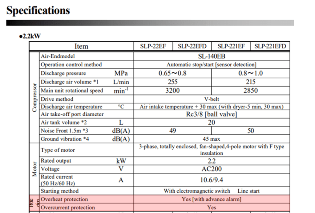 上面的規格表紅色區域顯示在自動控制上, 有過熱保護 (也具備預先警告功能) 以及過電流保護, 主要是避免馬達, 機體因為過電載或過熱燒毀. 設計這樣的保護機制, 基本上需要有溫度感測器 (temperature Sensor), 熱動電驛, 以及相關連動的控制設計; 藉此避免事態更加嚴重, 造成溫度越來越高而馬達或機體燒毀, 嚴重程度還會引發空壓機內部電源線絕緣破壞產生火花與隔音棉作用而自燃.