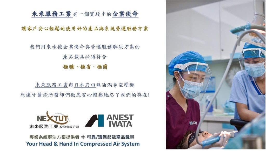 牙醫師與牙技師守護病患健康,也讓未來服務工業與日本岩田無油渦卷式空壓機系統守護牙醫師與牙技師們的健康!