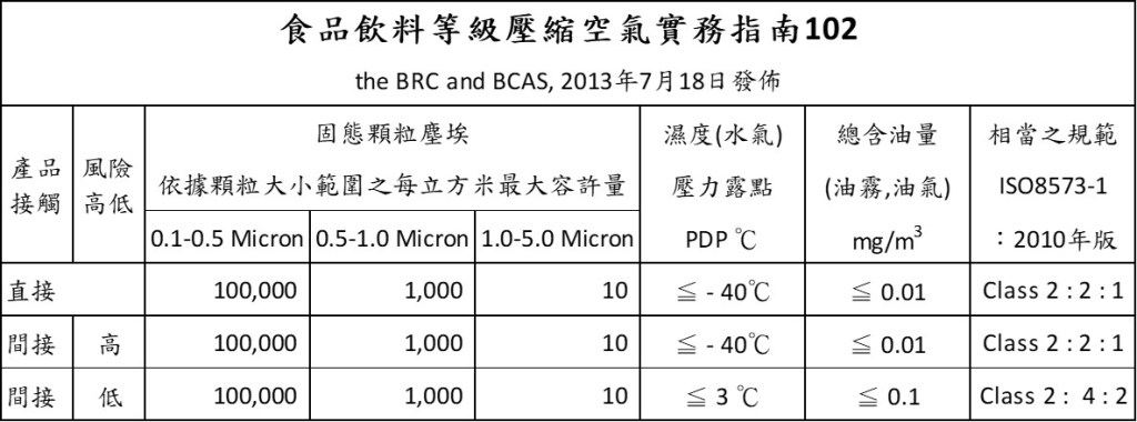 食品工廠採用的壓縮空氣品質標準依據BRC與BCAS 102指南區分為直接接觸、間接接觸以及無接觸三類;只要是有接觸食材,不管事直接接觸或者是間接接觸, 都必須確保壓縮空氣中的含油量極低, 且要低於0.01mg/m3以下(請參考下表)以及維持一定的乾燥程度。因為食品與飲料是給人吃進肚子的,所以建議採用無油式空壓機。