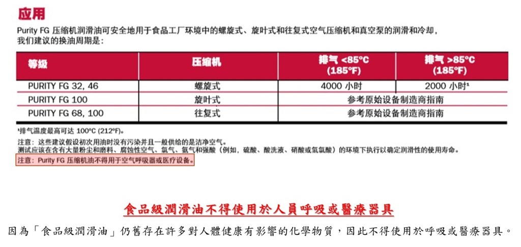 食品飲料行業雖然也允許空壓機採用潤滑油,但是不能採用化學工業級的潤滑油,而是要採取美國FDA允許的H1等級食品級潤滑油;然而雖然允許使用,也有非常嚴格的要求,那就是接觸到食材的含量必須小於10ppm (請參考下圖說明)。最重要的是即使是食品級潤滑油,其壓縮空氣也不能讓人呼吸或使用於醫療器材上。