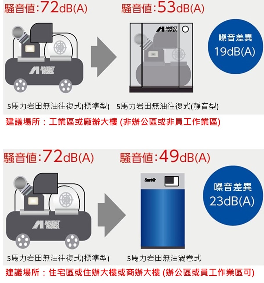 - 靜音型無油往復式空壓機 : 適合廠辦大樓、工業區 (內部也帶桶)。