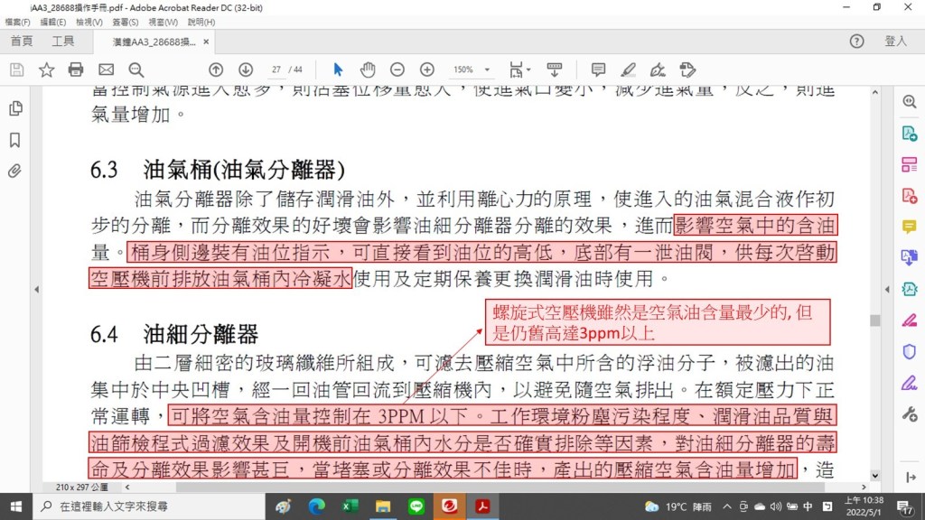 使用手冊提到油細分離器(必須定期更換), 且隨著更換時間使用越久,排氣含油量會越高; 前期排其含油量約3ppm;也就是說,假設一台五馬力有油式空壓機排氣量425L/分鐘,一年運轉2,000小時 (12,000分鐘), 就會產氣量5,100,000L/年。約略計算最好的狀況只有15.3公升 (約將近機車4L的黑油4罐) 的潤滑油會跑到工作現場或積在管路當中。