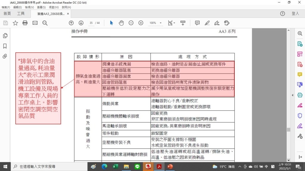 下表是油耗量 (排氣含油量) 相對較少的螺旋式空壓機使用手冊資料,進行分析。