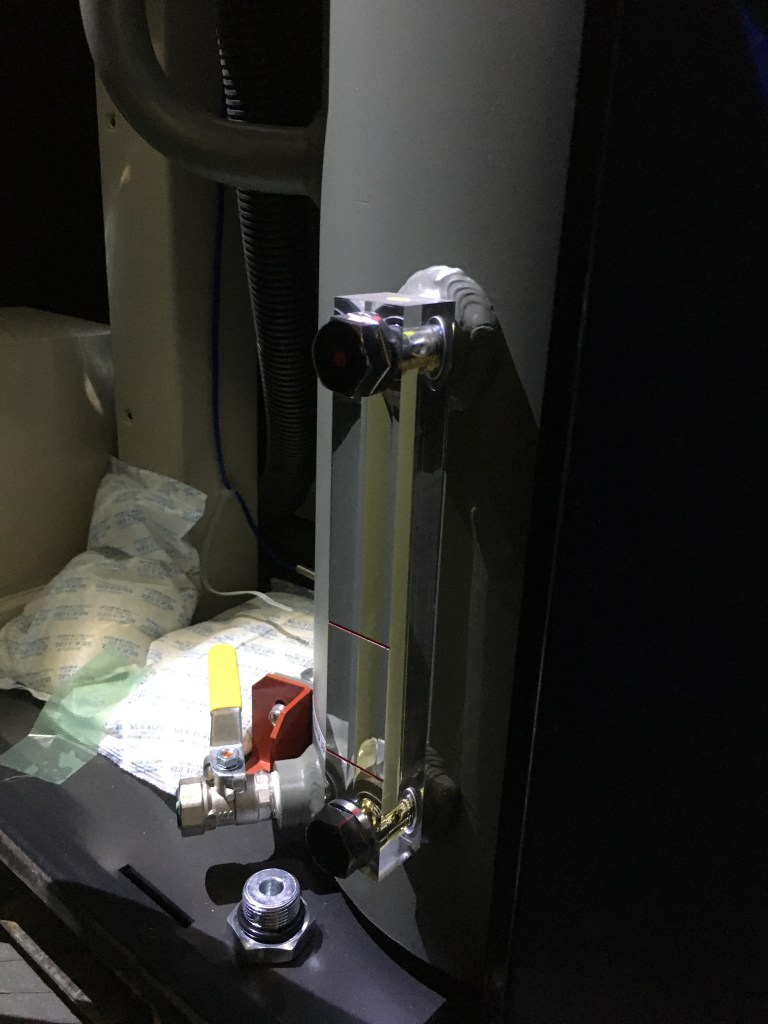 用過有油式空壓機的人都會被交代每天或者至少每週必須去看一下觀油鏡的油位,看看潤滑油是否太少了,以免機體燒毀或失去潤滑卡死。觀油鏡的種類不盡相同,例如:有的類似直尺狀刻劃上上下限油位 (例如下圖),有的則是圓形的油位視窗 (通常小型的空壓機會採用)。