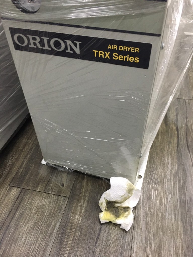 - 管路中積累油垢,長期容易在管路中滋生細菌,對於空氣環境衛生與空氣品質是看不到的影響。(請見下圖靠近機器設備的冷凍式乾燥機熱交換器吸入側吸入機器設備周圍空氣積累了一堆油垢;該乾燥機已經經過清潔之後仍舊從鈑金縫不斷滲出潤滑油)。