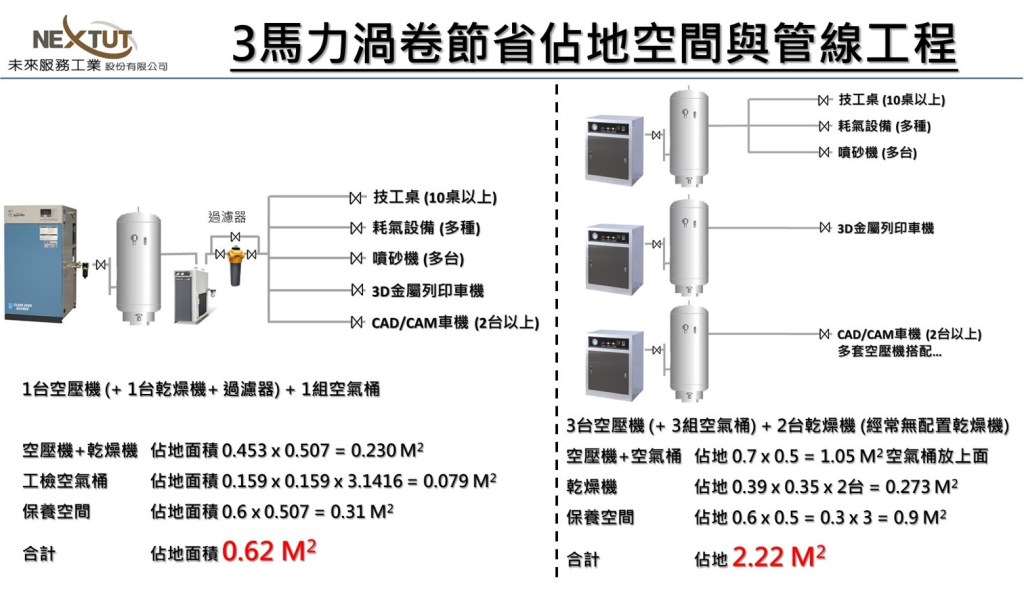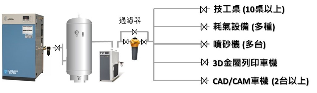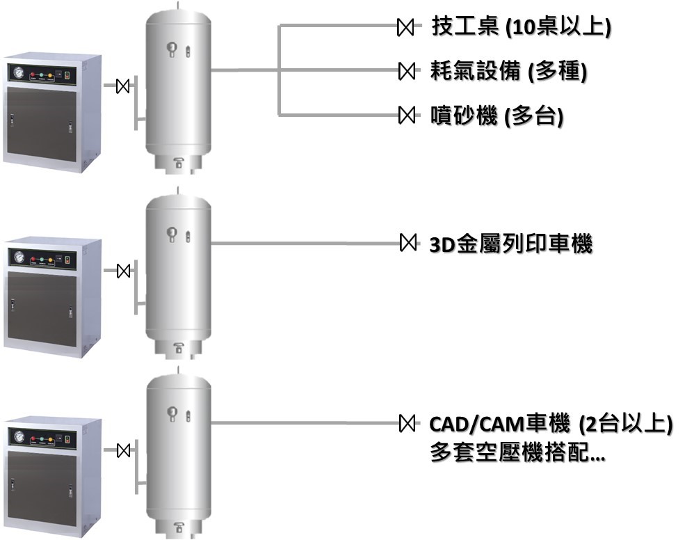 我們觀察到許多牙體技術所或牙醫診所提昇效率而採購了CAD/CAM車機或金屬列印車機, 而壓縮空氣來源通常採用一台車機配一台空壓機及一組空氣桶 (有的有加乾燥機有的則沒有; 但是大部分沒有安裝過濾器). 這樣的方式是最常見的匹配方式, 如果空壓機品質不要太差, 應該也能應付需求到一定程度. 也就是說, 其他用氣設備用一套空壓機, 車機或耗氣較多的設備一台搭配一套空壓機, 以牙體技術所而言, 至少會需要用到兩套空壓機.