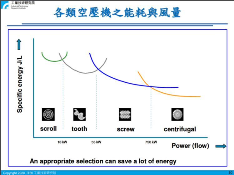 記得先前我們曾經分享給各位 牙科前輩關於不同種類空壓機在不同馬力數的能耗與排氣量的資料 (請參見下圖工研院研究資料) ,例如:以無油式空壓機來看,25hp以下的馬力數以無油渦捲式空壓機的能源效率最高;也就是說,每使用一度電 (1 kWh) 產生的風量最多。而超過30hp以上則以旋齒式空壓機能源效率最高、75hp以上又以螺旋式空壓機的能源效率最高、到了500hp以上則是以離心式空壓機的能源效率最高、超過5,000hp則又會是以軸流式 (類似飛機引擎) 空壓機能源效率最高。往復式空壓機的特點則是可以產生 15 bar (PE藥罐成型) 以上、25~30 bar (鎮暴車水柱)、35~40 bar (礦泉水寶特瓶)、400 bar (海軍艦艇及潛艦發射魚雷)、至600 bar (海底油礦天然氣探測) 的壓縮空氣則還是得使用往復式空壓機!