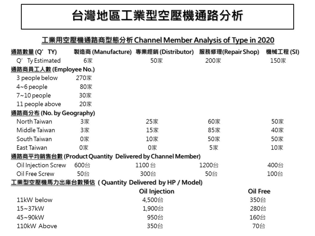 台灣專業的空壓機系統整合商總共有400家左右,其中機械工程整合商是以工廠或工程整體需要規畫中大型案件為主 (在統包工程中將空壓機系統設備涵蓋,之後還是由專業空壓機廠商進行售後服務),服務修理則多以有油往復式空壓機或者有油螺旋式空壓機系統為主要的推廣產品 (因為更換三濾一油是相對較輕鬆容易賺取利潤的技術服務項目),製造工廠具備設計研發加工能力的也主要是以工業用有油式空壓機為主。其餘則是進口國外機體或關鍵部品組裝的小型工廠。