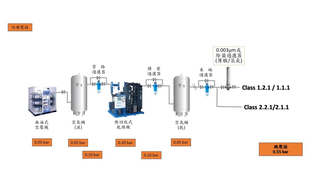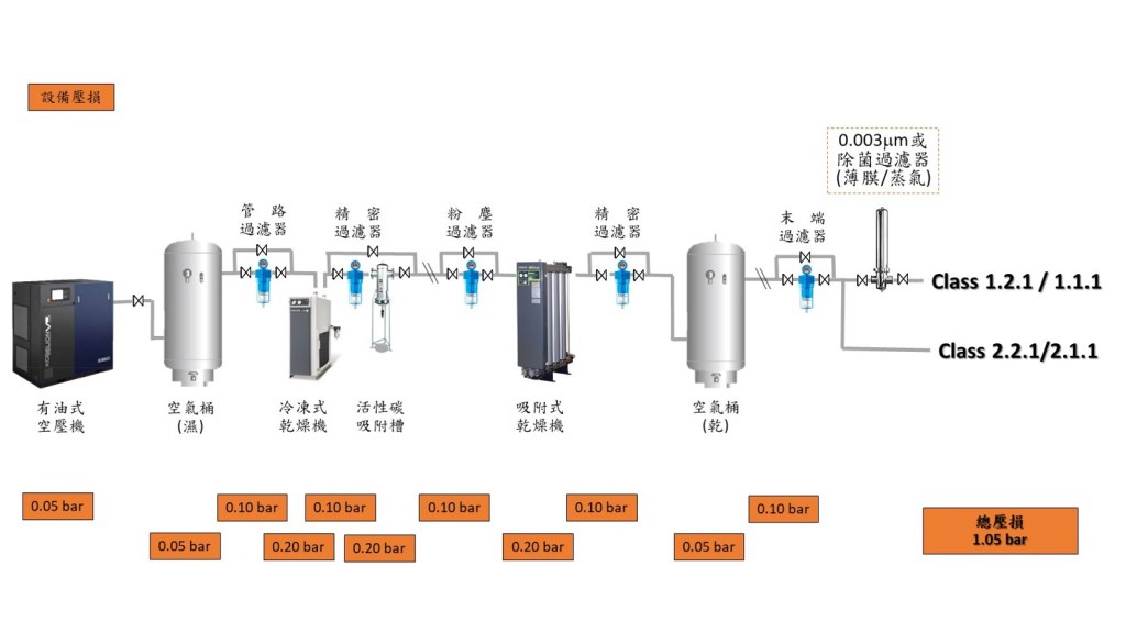 一台10馬力的有油式空壓機依據台灣產業發展基金會的調查,透過空壓機排出到輸氣管路或空氣中的潤滑油量約為5公斤左右;因此,許多行業十分在意製程的空氣品質,如果採用有油式空氣壓縮機想要達到ISO 8573-1 Class 2.2.1等級的空氣品質,那麼配置大概如下: