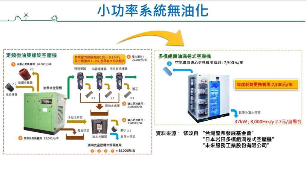參考台灣產業發展基金會的下面資料可以發現,無油化除了可以相對節省電費,確保乾燥過濾設備的效能,在節省每年保養費用部分也相對較為經濟。