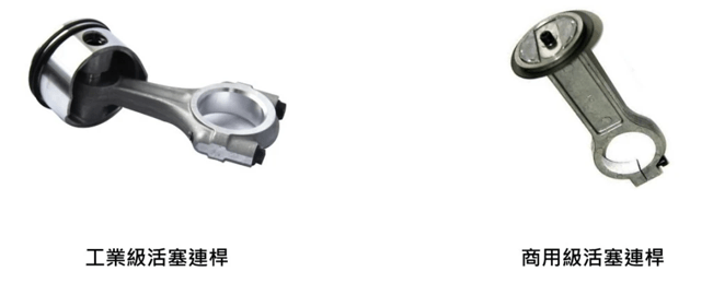 誠如先前所分析過的,商用型由於馬達實際啟動運轉時數低於900小時 (通常設計基礎為600小時),所以其機體內的主要部品零件均直接壓鑄成型,再簡單粗銑並搭配襯墊或O型環來避免洩漏,壓縮環活塞環也使採用較一般的材質;畢竟只要能夠滿足年運轉時數的設計基礎即可。當然,也就與工業級產生極大差異,我們就簡單以活塞連桿組來分析工業級 (圖左) 與 商用型 (圖右) 的比較。
