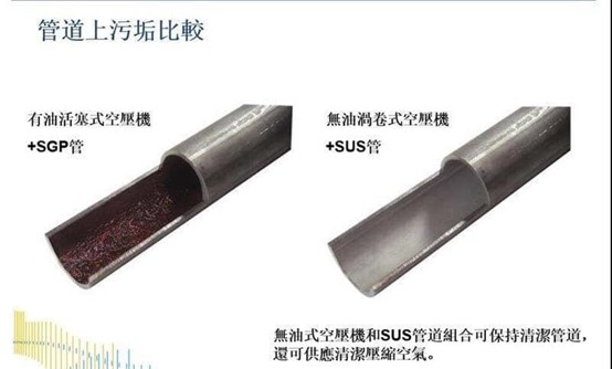 - 第一張照片:左側為有油式空壓機系統的管路內壁有油膜或油垢積累; 我們經常在許多研發實驗室看到精密加工機械 CAD/CAM 主軸利用壓縮空氣形成主軸內正壓高於外部大氣壓力來作氣封,避免其他物質進入內造成壽命縮短或損害。或者是精密機器中有許多電磁閥, 噴嘴, 位移部品元件由於壓縮空氣中含有油氣會如同左側的空壓管內壁形成油膜或油垢,造成精準度偏離或者壽命簡短。