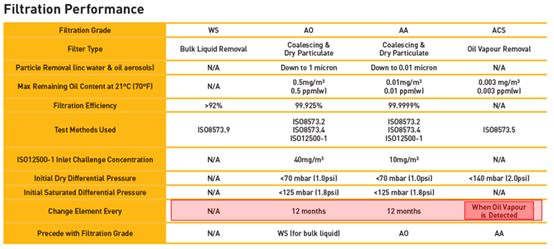 接下來我們來看看國際最大壓縮空氣過濾品牌的規格表,看它們為何就是不對活性碳過濾器做一定期間內的濾效保證或國際認證。