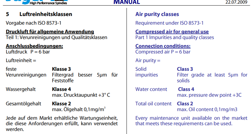 上面常見的車機主軸對於壓縮空氣品質有什麼要求呢?我們來看看該精密主軸經過長期驗證後提出來的壓縮空氣品質規格要求 (如下;資料來源同上)。