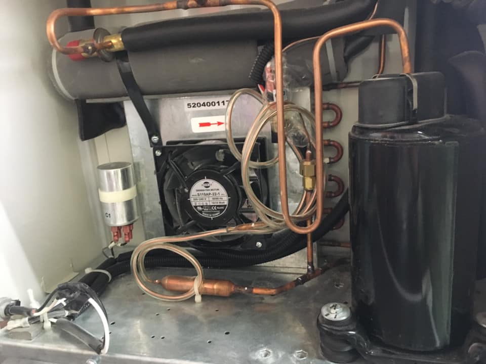 - 冷媒壓縮機的能力不同; 冷媒壓縮機有各種型式, 當然其內部的馬達繞組材質也會有不同. 使用條件較低的冷凍式乾燥機可能會考量銅管與冷媒壓縮機的成本, 而選擇採用大陸生產的低階冷媒壓縮機, 但是功率較高來節省銅管. 我們也曾經發現過日本品牌冷凍式乾燥機處理風量且入氣溫度都比較高, 但是冷媒壓縮機只使用0.3kW; 但是處理風量約僅有2/3且入氣溫度低很多的冷凍式乾燥機, 冷媒壓縮機卻使用0.4kW. 這些都後續會影響客戶的電力能源持續消耗.