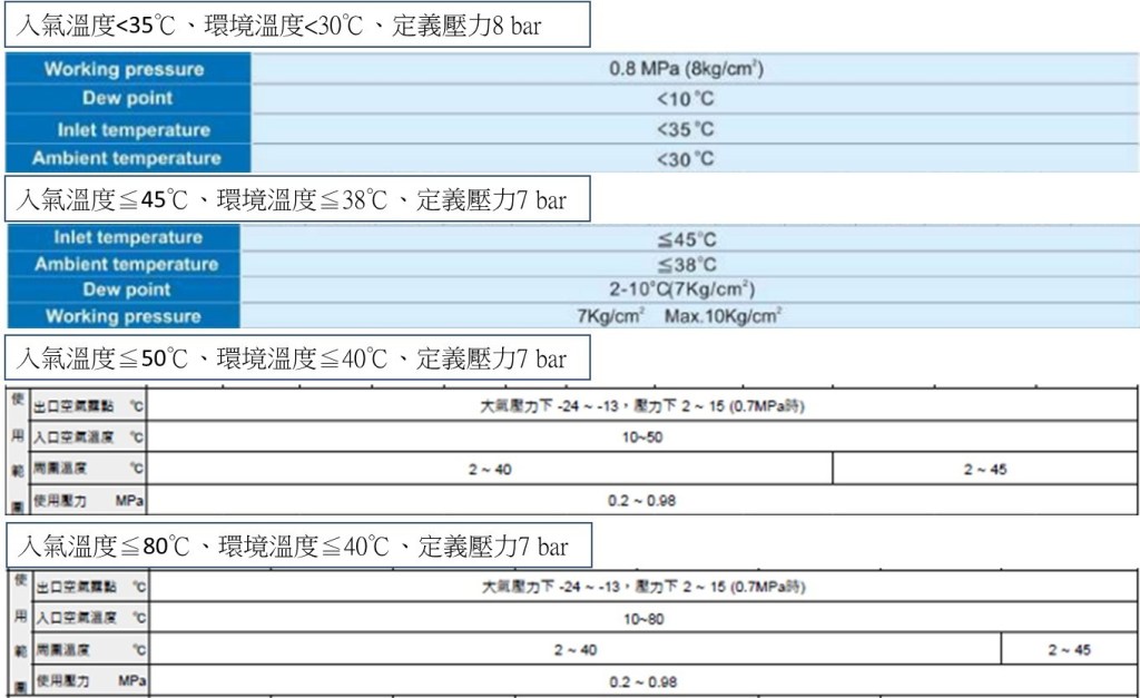 能夠處理的入氣溫度越高, 表示冷凍式乾燥機的能效越好;換句話說, 如果想要使用較低入氣溫度的冷凍式乾燥機, 那麼就必須控制入氣溫度:包括 環境溫度降低, 在乾燥機前使用氣水分離器, 讓空氣桶先降溫除水… 我們經常看到的有:
