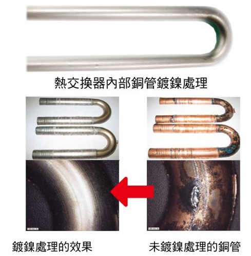 - 銅管的大小, 長度, 材質種類與型式設計不同; 入氣溫度越低的機型, 相同材質型式與尺寸的銅管數量會越少, 所以成本會越低. 有的可能會選用內螺紋增加接觸面積的海軍銅較高材質的銅管來增加熱交換量並減少尺寸數量.