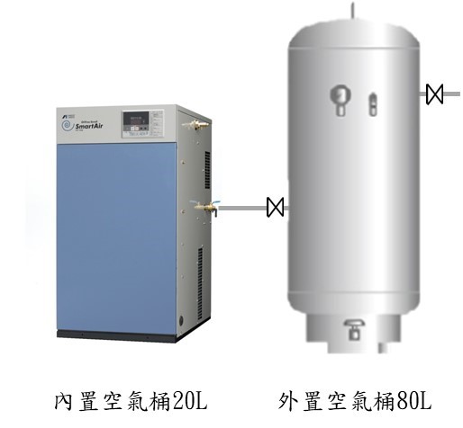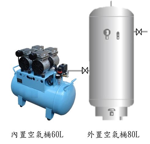 首先請各位前輩將連接空壓機的外置空氣桶出口閥門先關閉,然後再檢視看看空壓機是否有內置空氣桶 (例如:上圖岩田三馬力無油渦卷式空壓機有20L內置不銹鋼空氣桶) 或者空壓機下面有標配帶桶 (例如:下圖商用型三馬力空壓機有帶60L的鍍鋅黑鐵桶)。所以我們可以得到 三馬力渦卷的個案空氣桶總儲氣量是20L+80L=100L;而三馬力商用型無油空壓機個案空氣桶總儲氣量是60L+80L=140L。