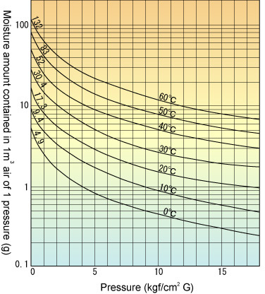 - 系統壓力:空壓機系統的操作壓力越高產生的冷凝水會越多 (請參考上圖)。