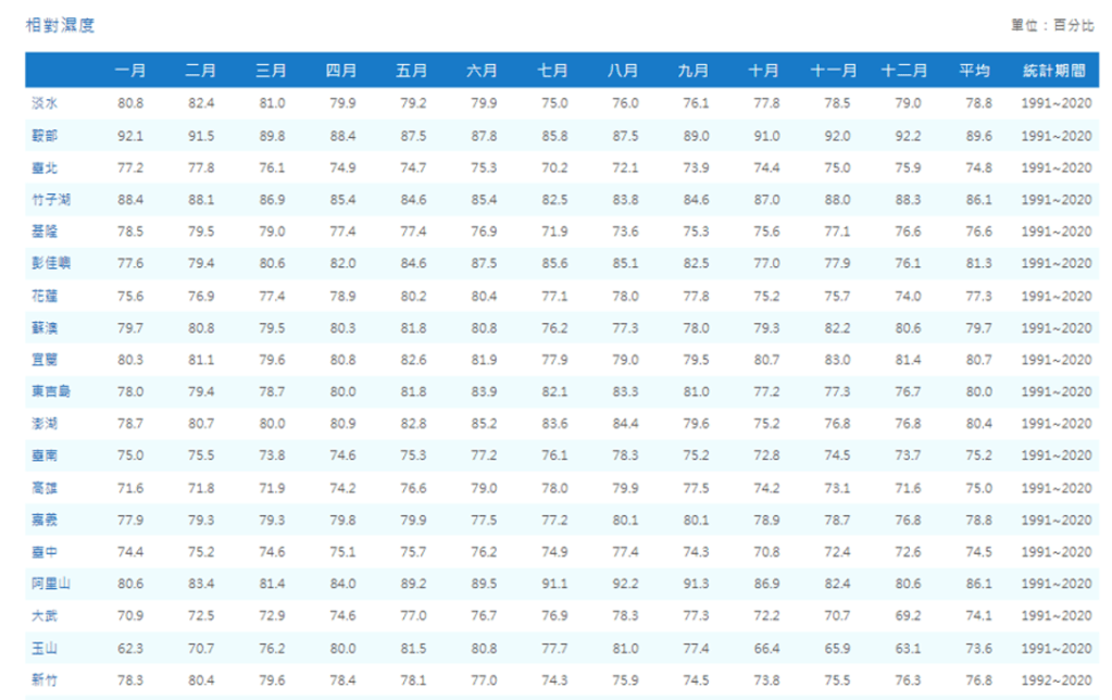 台灣平地氣候平均相對濕度75%~85%左右,有的地區甚至達到90%以上。
