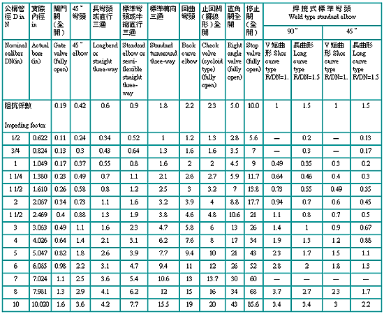 我們也經常看到類似下圖或下下圖的限流壓降節點設計(二分 1/4‘’)管徑;即使以等差級數來看,壓降也超過0.73 bar。如果加上管路接頭與縮管限流所造成的白奴力定律縮管造成流速變快的壓力損失,超過1.0 bar的壓降是很正常的。各種管路接頭相當於直管公尺數M的壓力損失係數參考如下表。