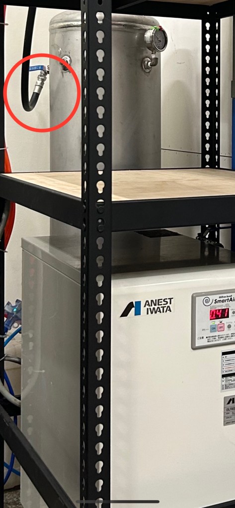多數牙醫診所或牙體技術所採用的牙科空壓機排氣量需求約落在岩田無油渦卷式空壓機三馬力至五馬力之間;參考上表管路壓降表(壓力損失)來看,如果是200L/min.若主管路採用四分管(1/2‘’),則每100米壓降約0.367 bar;但是我們最常看到的配置主管是類似下圖的外徑10mm(內徑6.5mm,約為二分 1/4‘’ 的管徑)。