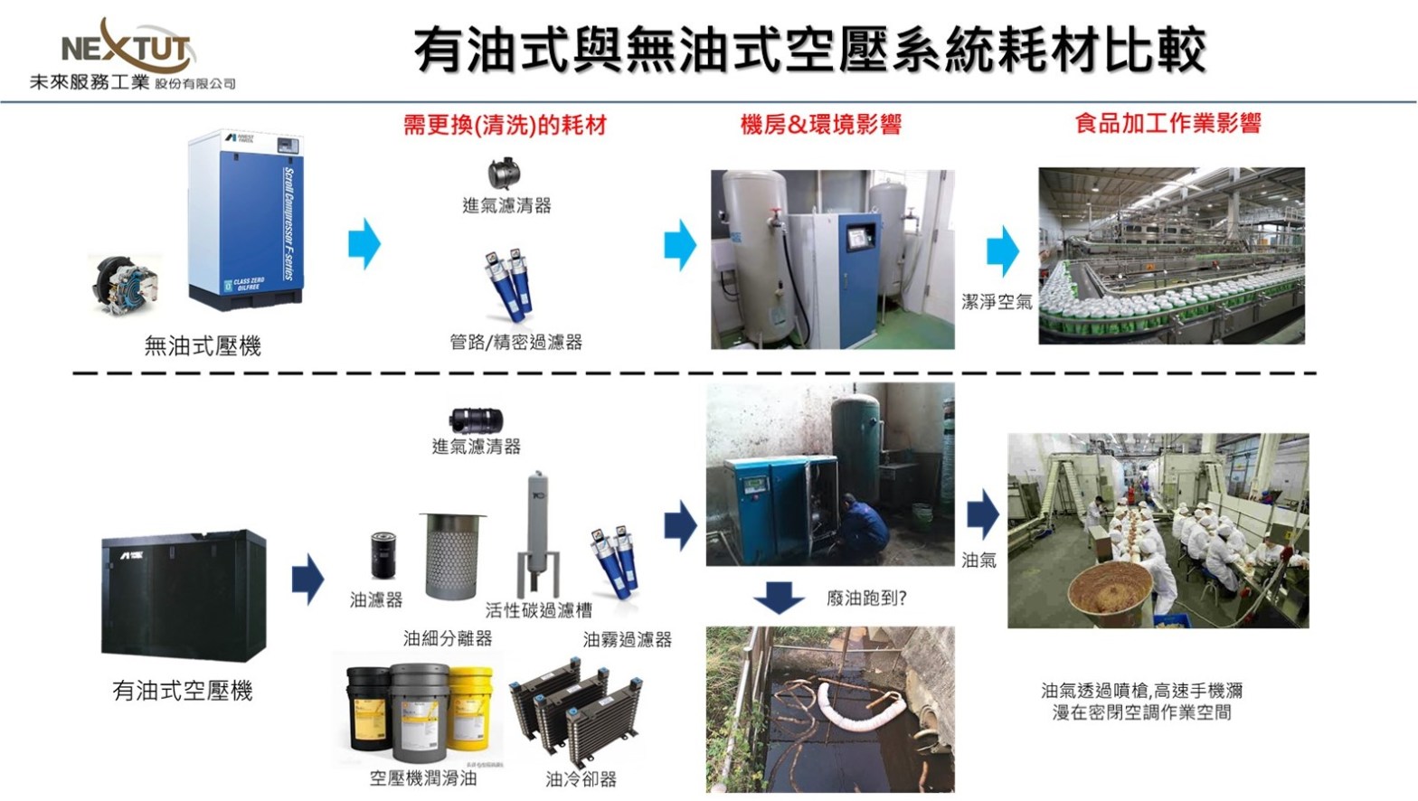 為價格因素採用有油式空壓機 (包括 : 有油渦卷式、有油往復式或有油螺旋式) ,而擔心幫客戶規劃的新空壓機排氣量不夠使用因此加大馬力數選型,這樣的結果往往會造成上述因為工業潤滑油溫度控制不佳所產生的種種可靠度與供氣穩定性問題,值得協助客戶規劃空壓機系統的廠商深入思考的!