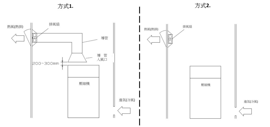 一般使用手冊內會建議空壓機系統最好有良好的通風(如上圖 : 岩田空壓機系統環境通風設計),並且維持環境溫度最好保持在35℃以下 (能夠在30℃左右更好),因為較高的環境溫度會造成–